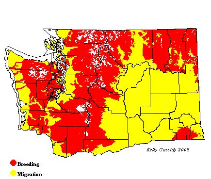 Hammond's Flycatchers can be found from late April to August throughout Washington where there is appropriate habitat. They breed in wet coniferous forests, from the lowlands to the tree line, although they are most common at middle elevations. During migration they are common in the lowlands, including wooded areas of the shrub-steppe zone.