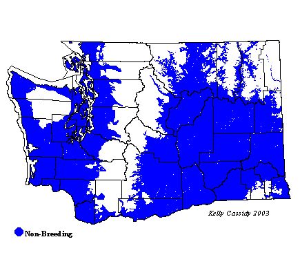 Winter visitors, Northern Shrikes can be found in Washington from late October to mid-April in appropriate habitat throughout the state. Their abundance varies, but they are typically more common in eastern than western Washington, and more common early in winter rather than later. In the shrub-steppe zone, Northern Shrikes are one of only a few species of songbird present in winter.
