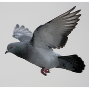 Rock Pigeons, more commonly known simply as just "pigeons," are familiar birds in any developed area. Chunky birds with sharply pointed wings, Rock Pigeons are found in a variety of colors and patterns, although all gray is most common. Rock Pigeons have black bills with white fleshy bases, red eyes, red fleshy eye-rings, and salmon-colored feet.