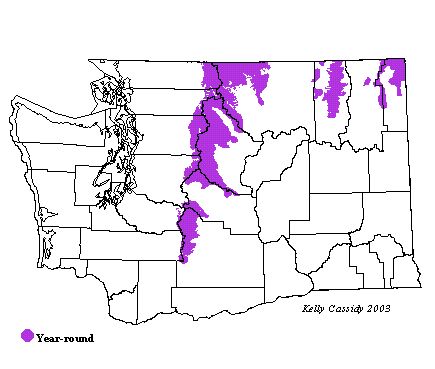 Spruce Grouse are uncommon in northern Washington east of the Cascade crest. They can be found west of the Cascades in Whatcom County and northern Skagit County. They are rare at high elevations in suitable forests along the Cascade crest, south into Yakima County. Most sightings are in Okanogan, Ferry, Stevens, and Pend Oreille Counties. Many experts claim that they do not occur in the Olympic Mountains, although there is some equivocal evidence to the contrary. They also occur in very low numbers in the southern Cascades, but are easily confused with Blue Grouse which are more common in that region.