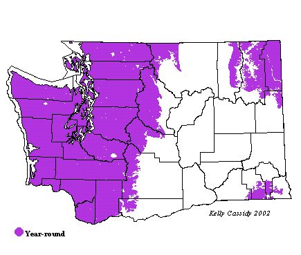 Chestnut-backed Chickadees are permanent residents in wet coniferous forests throughout the state. The majority of these habitats are in western Washington, where this bird is abundant, but some areas of eastern Washington provide suitable habitat as well. Chestnut-backeds are probably the most abundant chickadee species west of the Puget Trough and are the only chickadee just to the north on Vancouver Island, BC.