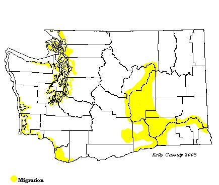 A strongly migratory species, the Franklin's Gull spends the winter south of the equator along the west coast of Central and South America. Spring migration is a fairly direct trip from the wintering grounds to the breeding grounds. The closest breeding colony to Washington is at Malheur National Wildlife Refuge in Oregon, where the birds arrive in late April or early May. After the breeding season, the gulls begin a protracted period of wandering throughout their range. This wandering lasts from mid- to late July and continues until September or early October, when they begin to migrate southward.